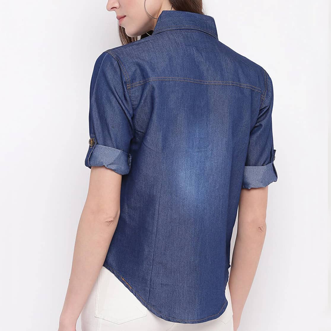 Blue faded casual shirt, has a spread collar, three-quarter sleeves, button placket, and curved hem