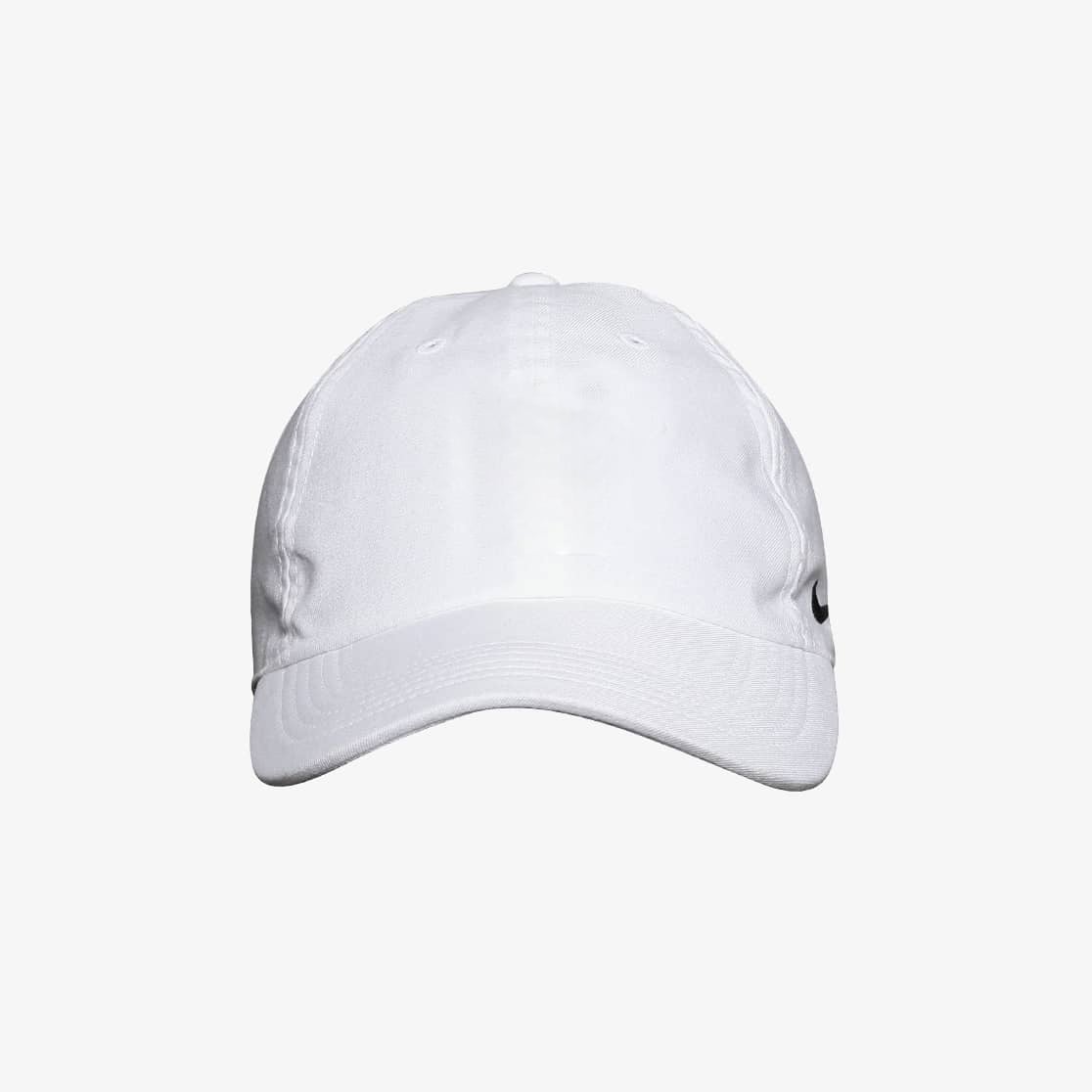 White cap engineered with DRI-FIT and AEROBILL technologies, has a panelled crown with embroidered eyelets, a curved visor, an adjustable buckle closure on the back